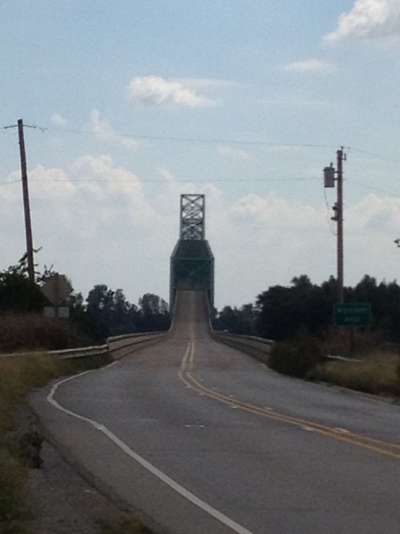 Anyway, after I left Missouri I headed into Illinois. A few people warned me about the bridge from Missouri to Illinois that crossed over the Ohio River. They also warned me about the bridge from Illinois to Kentucky which crossed the Mississippi. Both of these bridges were less than a quarter of mile apart (since this is the area where the Ohio and Mississippi meet) and both of these bridges did not have any kind of shoulder. As I neared the first bridge, I was worried about how I would get across, but I figured I would just go as fast as I could. Crossing bridges that offered no shoulder was not a new thing for me. I ended up getting to the first bridge when a man with a truck pulled over. He offered me a ride across the bridge claiming that with my cart it would be “hell” getting across. I took him on his offer. I rode across the bridge and he dropped me off on the other side, outside of a small building, a historical landmark/museum. He said he had to go to a near Illinois town and he would be back to pick me up and take me across the bridge that crossed the Mississippi. Isn’t getting a ride considered cheating??? Yes! This is why when he drove off I left my cart outside the small museum and walked across both bridges untethered. It took me a while and even walking across the bridges was scary. Shoulders didn’t magically appear so I was forced to walk on the very edge, smashed up against the railing.