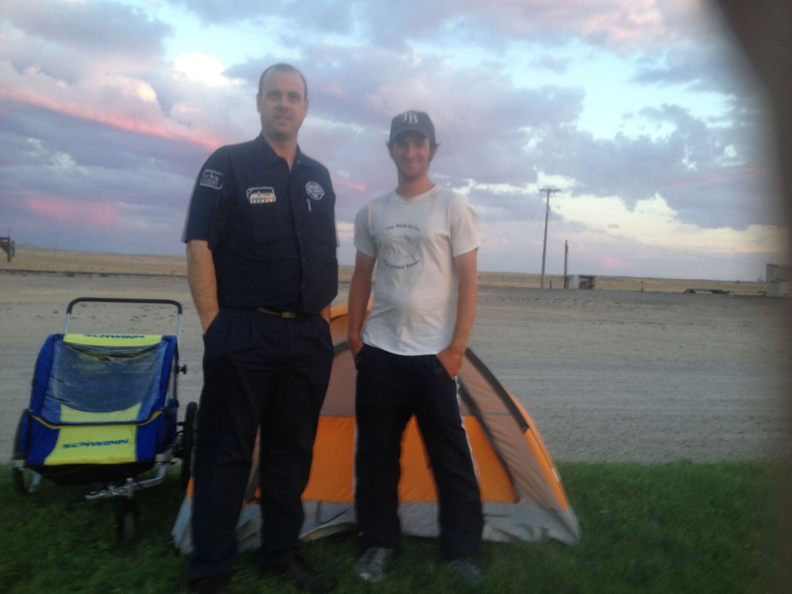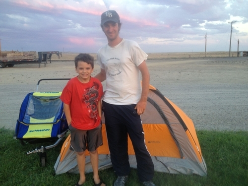 I walked the 100 miles in 3 days. On the second day of my trek a man had pulled over and asked if I needed a ride. I declined and told him I was walking across America. He thought my story was interesting and said that he lived in Casper (the city I was heading towards). He offered me a place to stay and gave me his card. It turned out he was a pastor. I thanked him and told him I would most likely take him up on his offer. The next day I arrived in Casper and gave him a call. I met him at a gas station and he gave me a ride to his house. I was introduced to his wife and son and they set me up in their guest room. They were very kind. I needed to restock my food and fix the front tire on my cart (the plastic was wearing out). They let me stay there an extra day so I could get my errands finished. They also supplied me with awesome cooked meals like ribs and lasagna. When my time came to depart I thanked them again and we exchanged information so that I could keep in touch as I continued my travels.