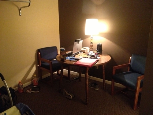 The next few days weren’t as easy. It started raining every day and a lot of the roads had hardly any shoulder. A few times over the course of the week I had cops stop me and offer assistance. Many of them though what I was doing was cool. On 9/17 I headed from Rolla to Salem. I was trying to find a faster route than following highway 63 south because that highway went west before it went east again. I found a smaller road that cut diagonally through Salem and south toward highway 60. While walking to Salem it began to pour. It was raining so hard I had to pull over and huddle under my poncho. I waited out the storm before moving on again. I was trying to hit a campground just outside Salem until I met the Sheriff who informed me that that campground did not exist. Thanks a lot Google Maps!! So instead the Sheriff told me of a park I could camp at that had a small pavilion. That’s where I headed and around 9 P.M. the Sheriff arrived to check up on me and give me a burger from Sonic!The next day I checked the weather and found another storm approaching. My goal was to take a small road from Salem all the way to highway 60. This road was only two lanes and did not have a shoulder. It was also 60 miles long. I did not want to travel on it in the rain so I ended up finding a motel. After talking to the owner, she informed me that she would not charge me for the room so I decided I would stay there two nights and work on homework. My homework consisted of working on my thesis which ended up taking longer than I thought. Kim, the owner of the Ranch Motel, told me that I could stay as long as I want so that I could finish my homework. So I did. I stayed for five days! My thesis turned out to be twenty pages long. Kim was really nice for letting me stay there, but not only that, she showed me around town, brought me to a fishery, bought me food and supplies, and brought me to her house for dinner and to meet her son and husband. Also, she realized that the road I was going to travel on was really unsafe so she offered to take my cart and deliver it to me when I reached the highway. So the next two days I walked along the curvy road through the woods carrying a small backpack filled with Gatorade and protein bars. This really helped out because it would have been hell pushing my cart on that road.